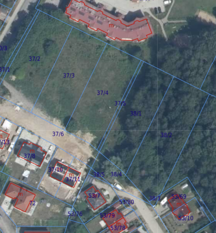• Niezabudowana nieruchomość gruntowa o łącznej powierzchni 9145 m², składająca się z działek: 37/2, 37/3, 37/4, 37/5, 38/1, 38/2, 38/3